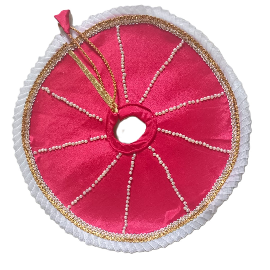 Dress your beloved Laddu Gopal / Kanha Ji in this exquisite Handcrafted Kanha Ji Poshak, designed with devotion and elegance. The beautiful pink satin fabric is decorated with white pearl work arranged in radiant lines, complemented by a delicate golden lace border and pleated white frill edge for a divine finish.