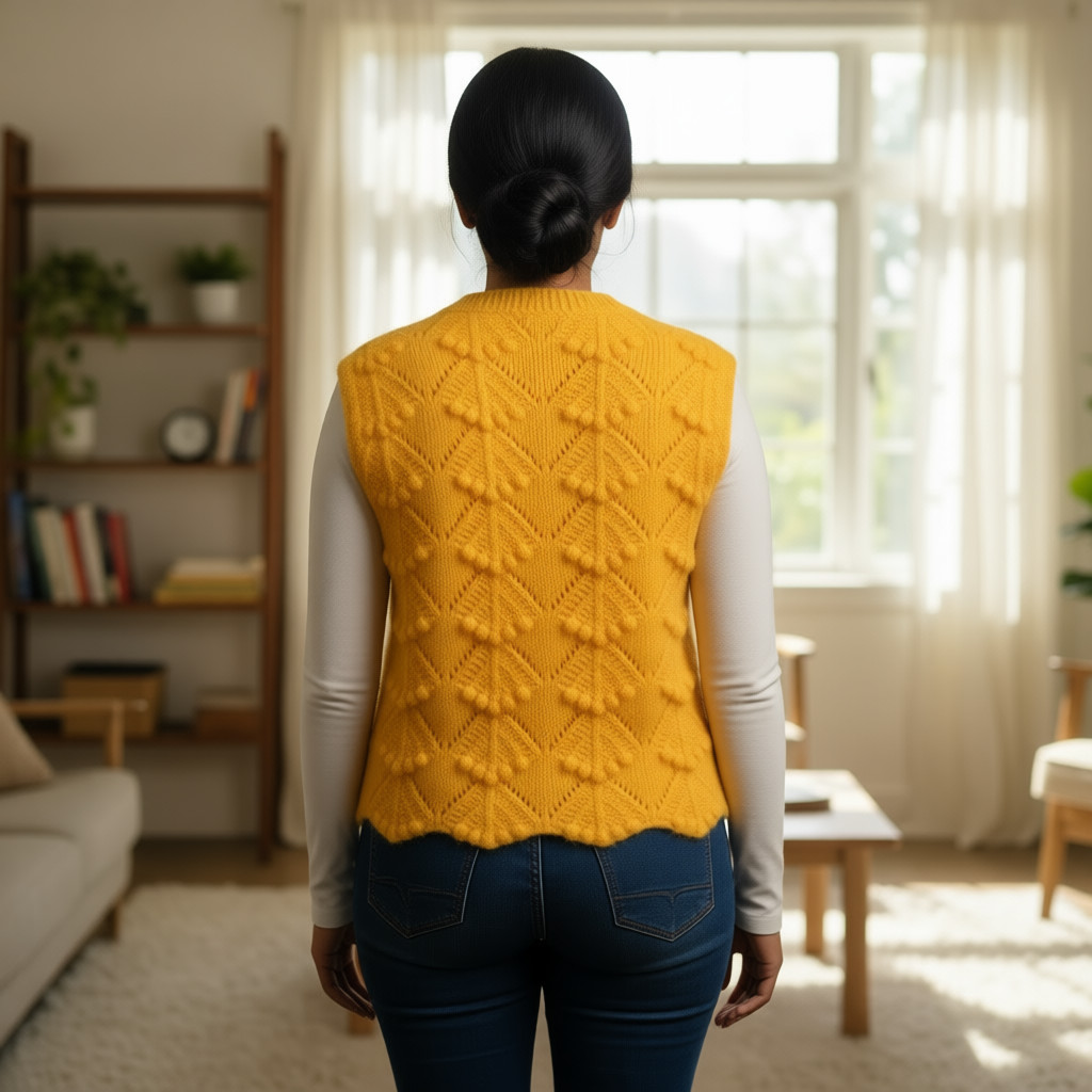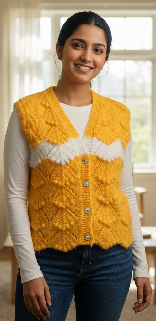 Give her extra comfort and warmth with this handmade knitted cardi in cheerful yellow with a charming white band. Designed with delicate patterns and soft, skin-friendly yarn, it is perfect for keeping her cozy during chilly days. Makes a thoughtful, adorable gift for any occasion.
